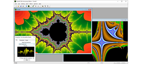 • Software written in Visual C++ 2017 that allows you to plot several fractals, including the Mandelbrot Beetle and the 3D Julia Quaternion. You can try it out by downloading the software executable for free from here.